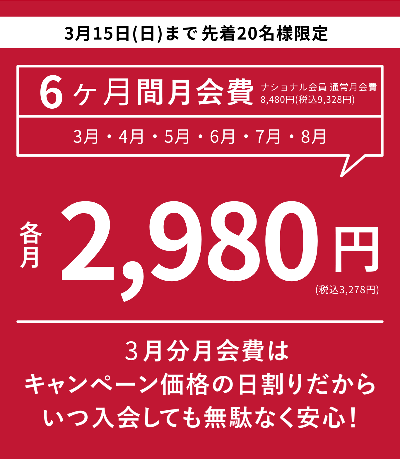 ◆6ヶ月間(3月・4月・5月・6月・7月・8月)各月2,980円(税込3,278円)!!(通常月額9,328円税込)