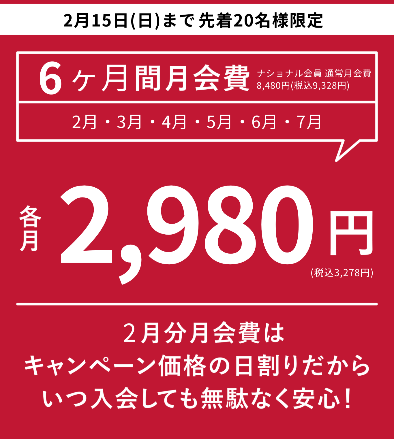 ◆6ヶ月間(2月・3月・4月・5月・6月・7月)各月2,980円(税込3,278円)!!(通常月額9,328円税込)
