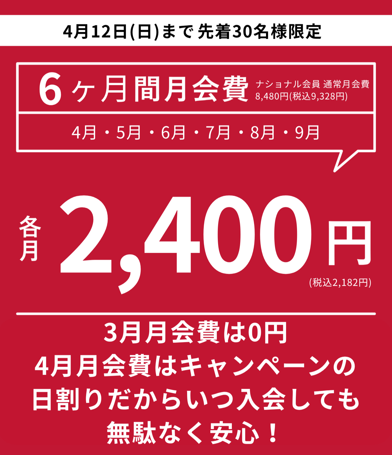 ◆6ヶ月間(4月・5月・6月・7月・8月・9月)各月2,4000円(税込)!!(通常月額9,328円税込)