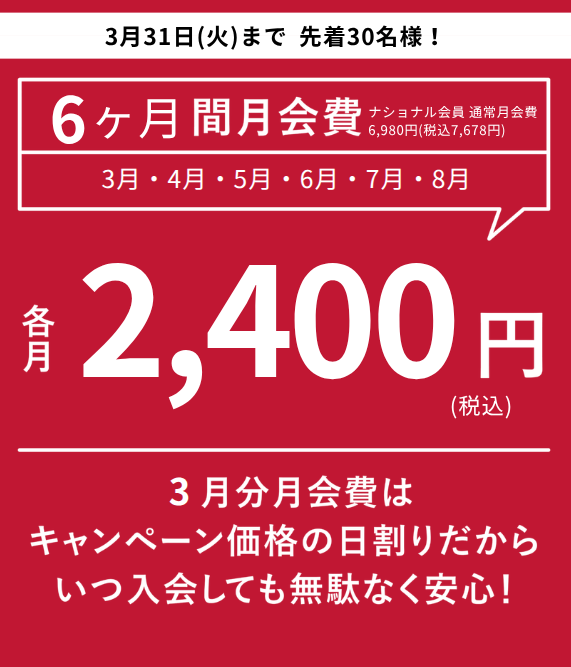 ・3月~8月の月会費(通常 7,678円税込) ➔ 各月2,400円(税込)