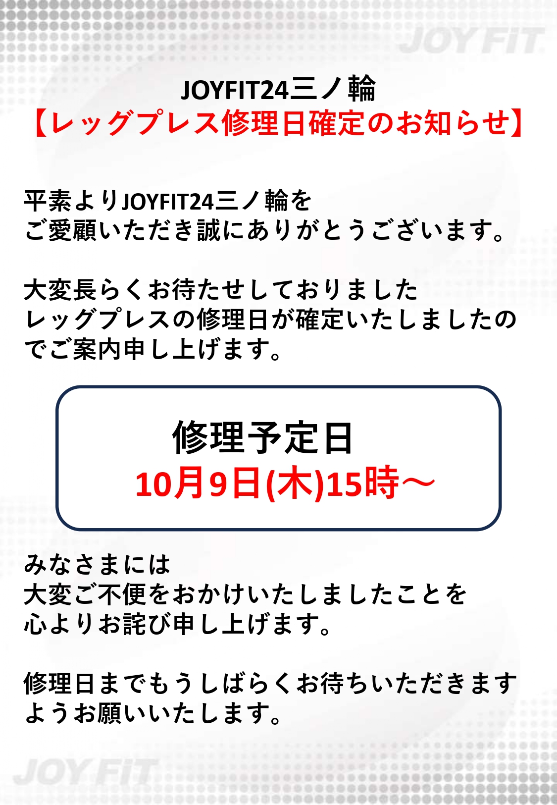 JOYFIT24三ノ輪 【レッグプレス修理日確定のお知らせ】