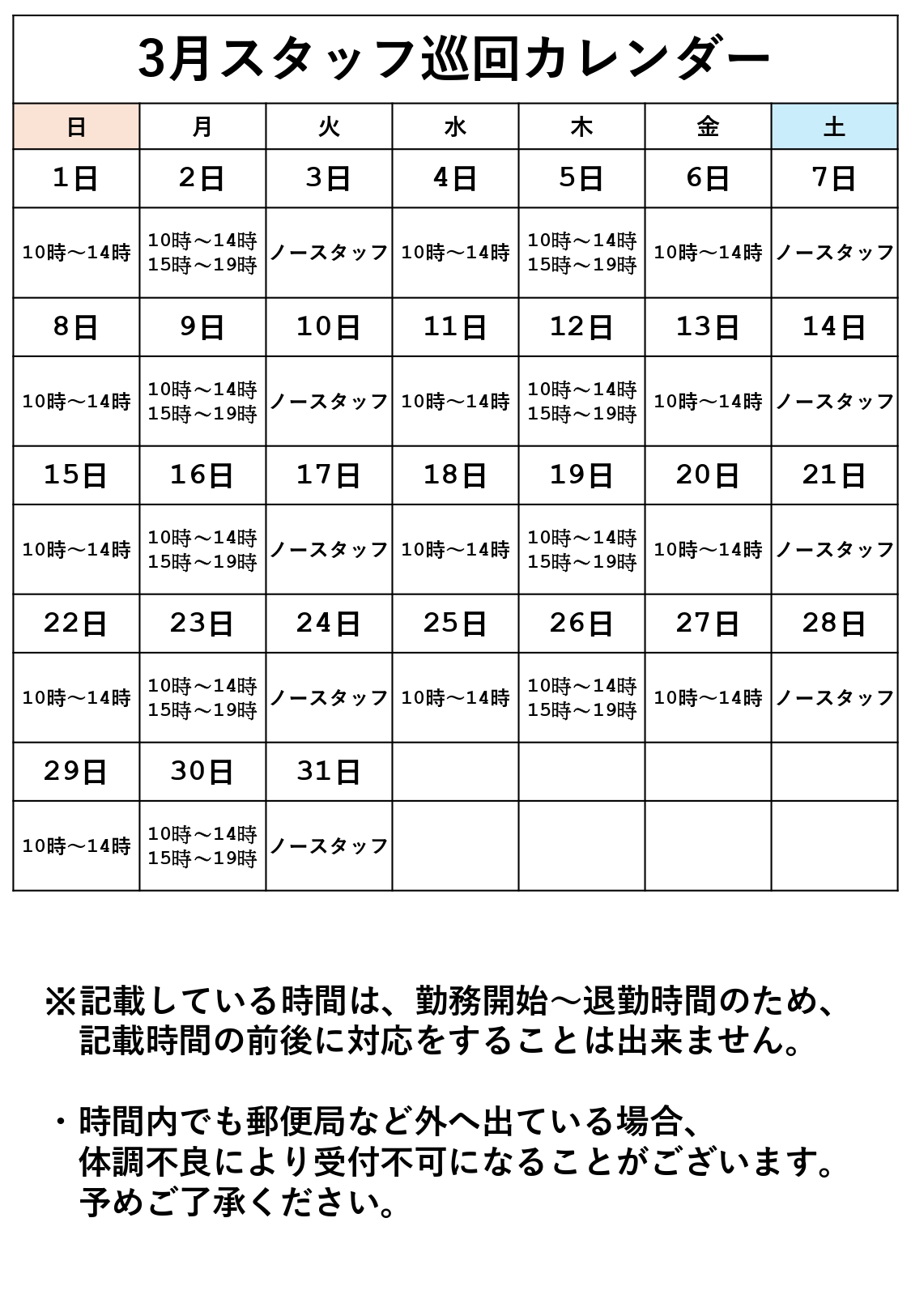 3月 スタッフ巡回カレンダー