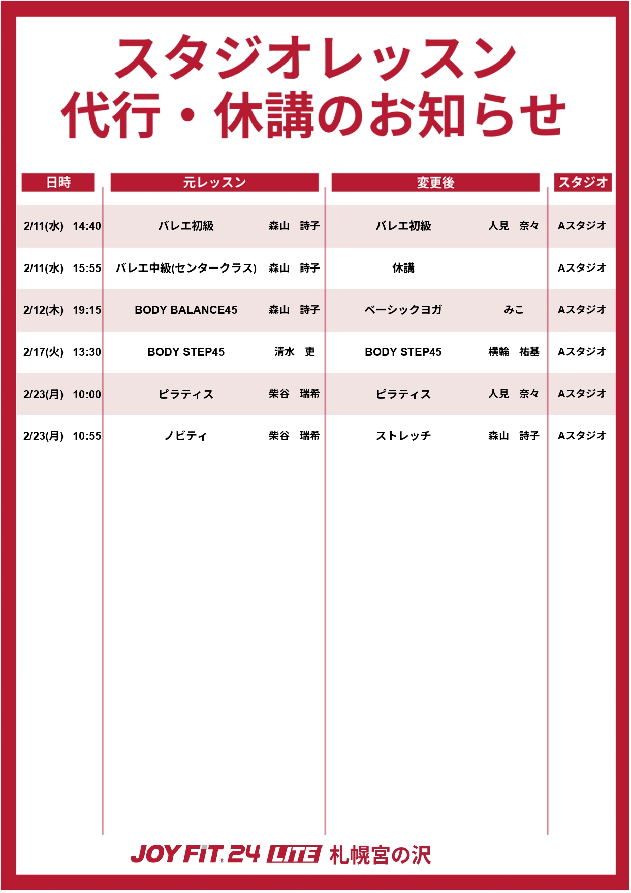 | その他 | ******************************************************* 【入館をお断りするお客様について】 ・お酒をお召し上がりになっているお客様 ・他のお客様へご迷惑行為を行なうお客様 ・スタッフの指示に従わないお客様 上記お客様につきましては入館をお断りしております ******************************************************* 【服装について】 ・運動に適した服装をお願いいたします。 ・運動靴の着用は必ずお願いいたします。 【スタジオのご利用について】 ・レッスンが始まる15分前からスタジオ前にて整列をお願いいたします。 ・レッスンが始まりましたらお怪我防止の為、途中入場はお断りしております。 ・空腹・睡眠不足・疲労・体調不良等の場合は参加を控えていただくようお願いいたします。 ・レッスン中の体調不良時はインストラクターの指示に従うようおねがいいたします。 ・レッスン終了後はすみやかにスタジオから退室をお願いいたします。 ・レッスン中の携帯電話のご利用はお断り申し上げます。 ・お互いにマナーを守り、参加する皆様が楽しくレッスンを受けることができるようご協力をお願いいたします。 ******************************************************** 【貴重品の扱いについて】 ・貴重品等はお客様各位にて管理をお願いいたします。 ・更衣室・深夜スペース内にロッカーがございますので、必ず鍵をかけてご利用くださいませ。 ・鍵は身体から離さず管理するようお願いいたします。 ・フロントでは鍵のおあずかりはいたしかねます。 ・紛失・盗難等につきましては当店は一切責任を負うことができませんのでご承知おきくださいませ。 ******************************************************** 【宮の沢店以外のJOYFITご利用について】 ◎ 全国相互利用のお手続きをされているお客様 ・宮の沢店でお手続きした際に発行された会員カードがあれば、ご利用可能です。 ※一部他店舗会員様が利用できない店舗や、有料利用の店舗などもございますが、 それ以外の全店舗利用に際し別途料金はかかりません。 ◎ 全国相互利用のお手続きをされていないお客様 ・他店舗のご利用は出来ません。 ※一部有料にてご利用可能店舗もございます。フロントにてご確認くださいませ。 ******************************************************** 詳細につきましては、ご入会時に館内の説明と、初回ご利用時にオリエンテーションにて ご案内しております。ご不明点・ご指摘等ございましたらお気軽にスタッフまでお申し出くださいませ。 |