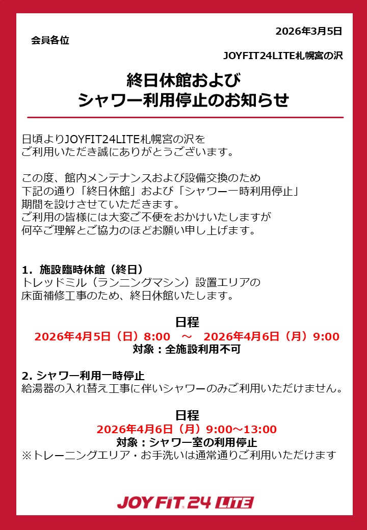 休館およびシャワー一時利用停止のお知らせ