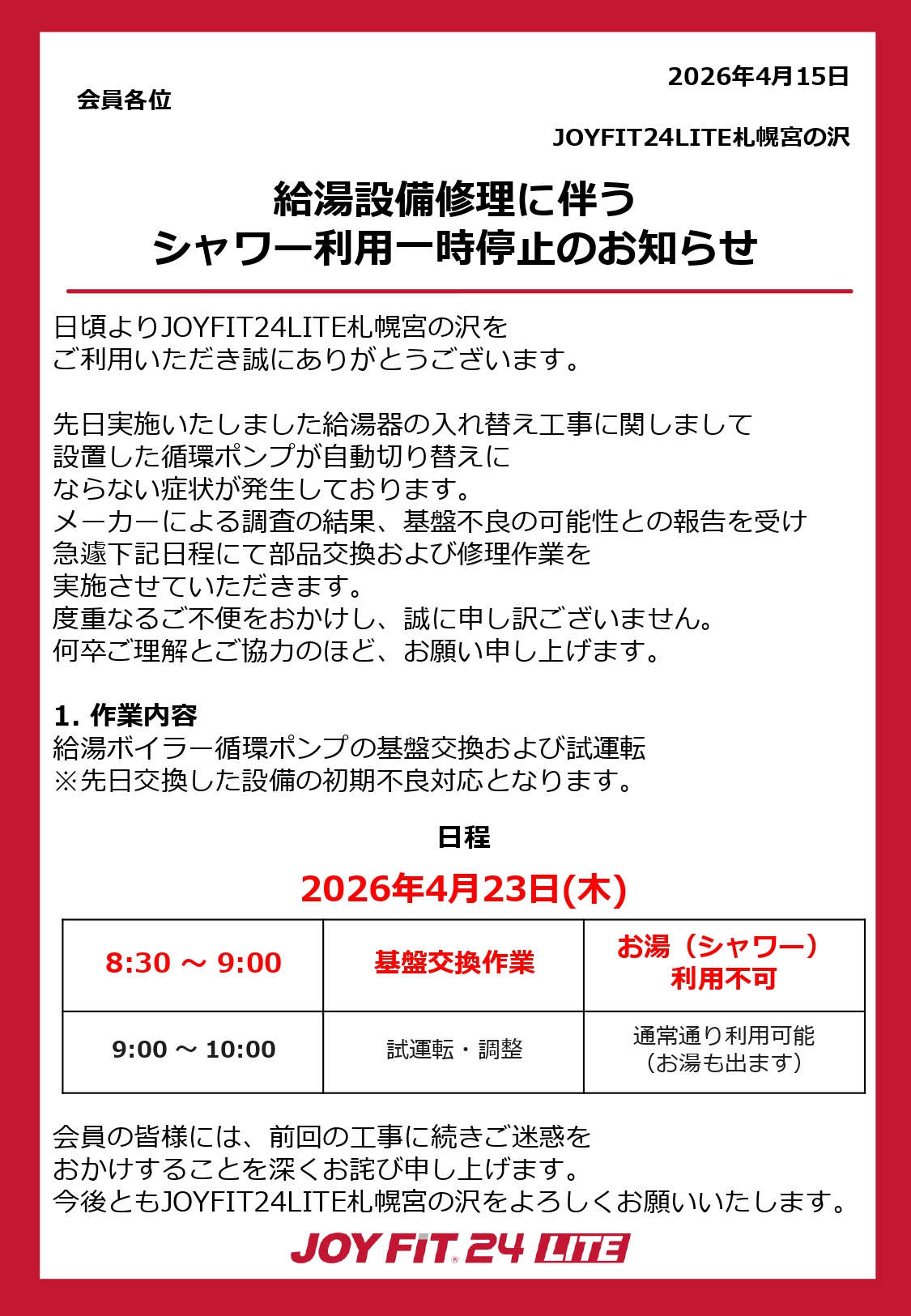4/23(木) 8:30‐9:00一時シャワー利用停止のお知らせ