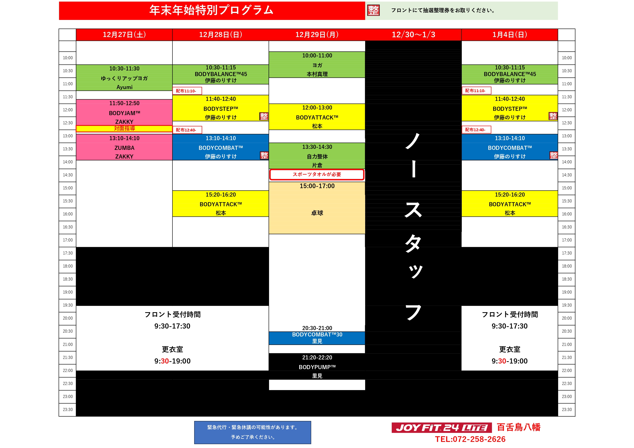 【スタッフ在中時間】 平日 09:30〜23:00 土日祝 09:30〜19:00 ※年末年始/GW/お盆など、時間の変更がある場合がございます。 【フロント受付時間】 平日 09:30~15:00 17:00~20:00 土日祝 09:30~17:30 ※ご入会受付などは終了時間の30分前までにお越しください。 フロント受付時間以降お問い合わせ等は出来かねますので予めご了承ください。 |