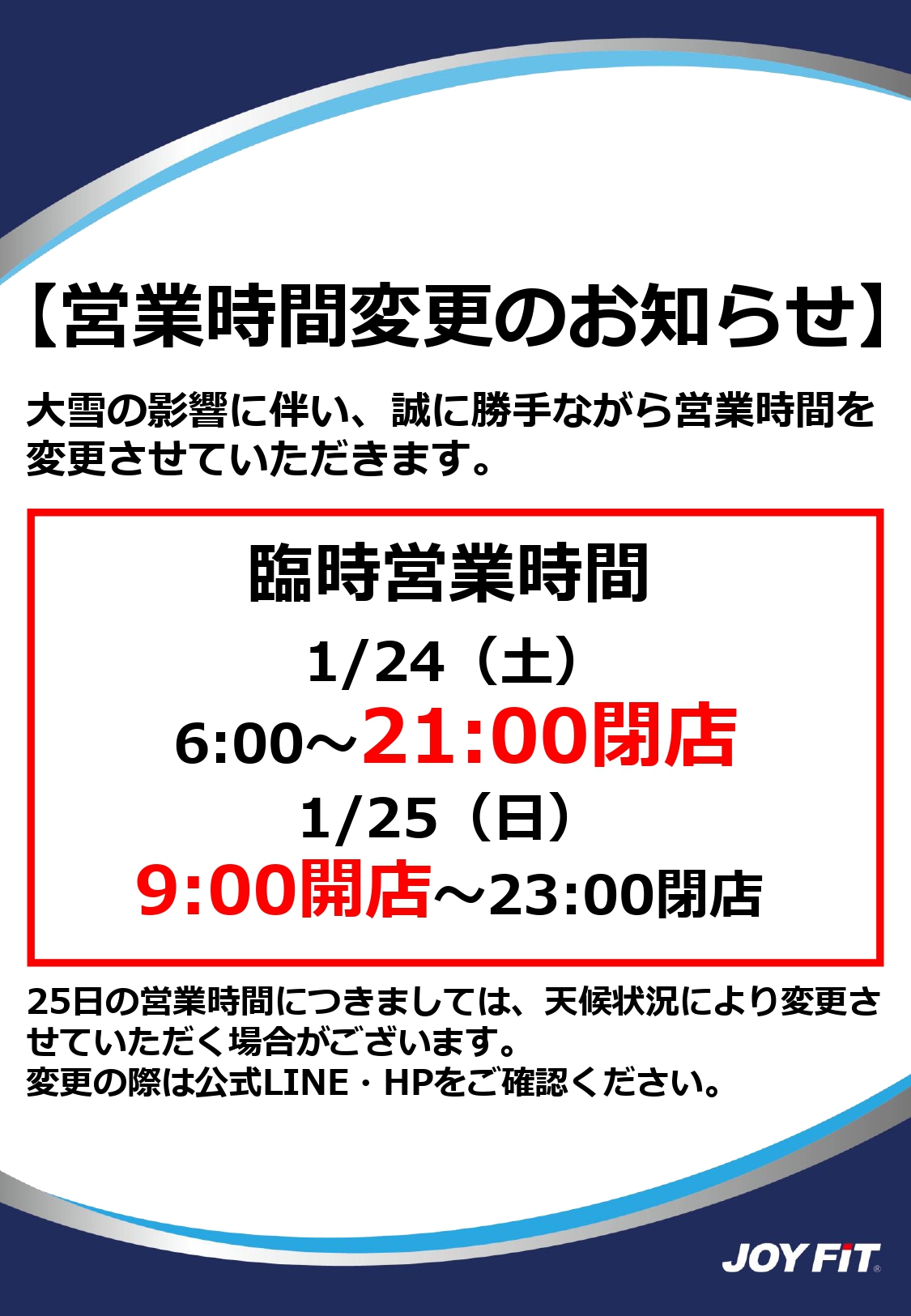 上記の通り、大雪の影響に伴い営業を短縮させていただきます。
