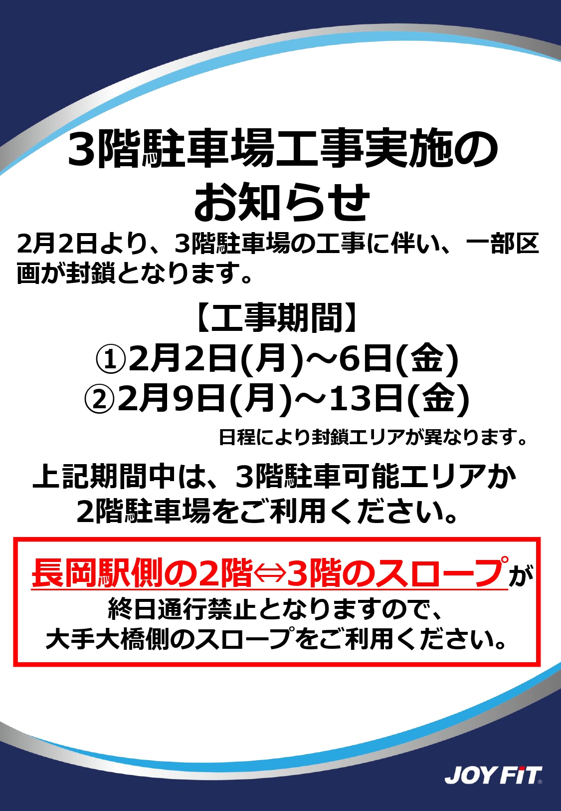 【お知らせ】ウオロク3階駐車場工事について