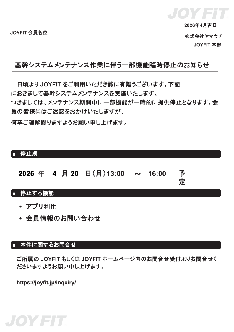 4月20日 13:00~16:00にてメンテナンスの為、アプリでの入退館が出来なくなります。