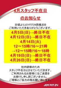 4月スタッフ不在日のお知らせ