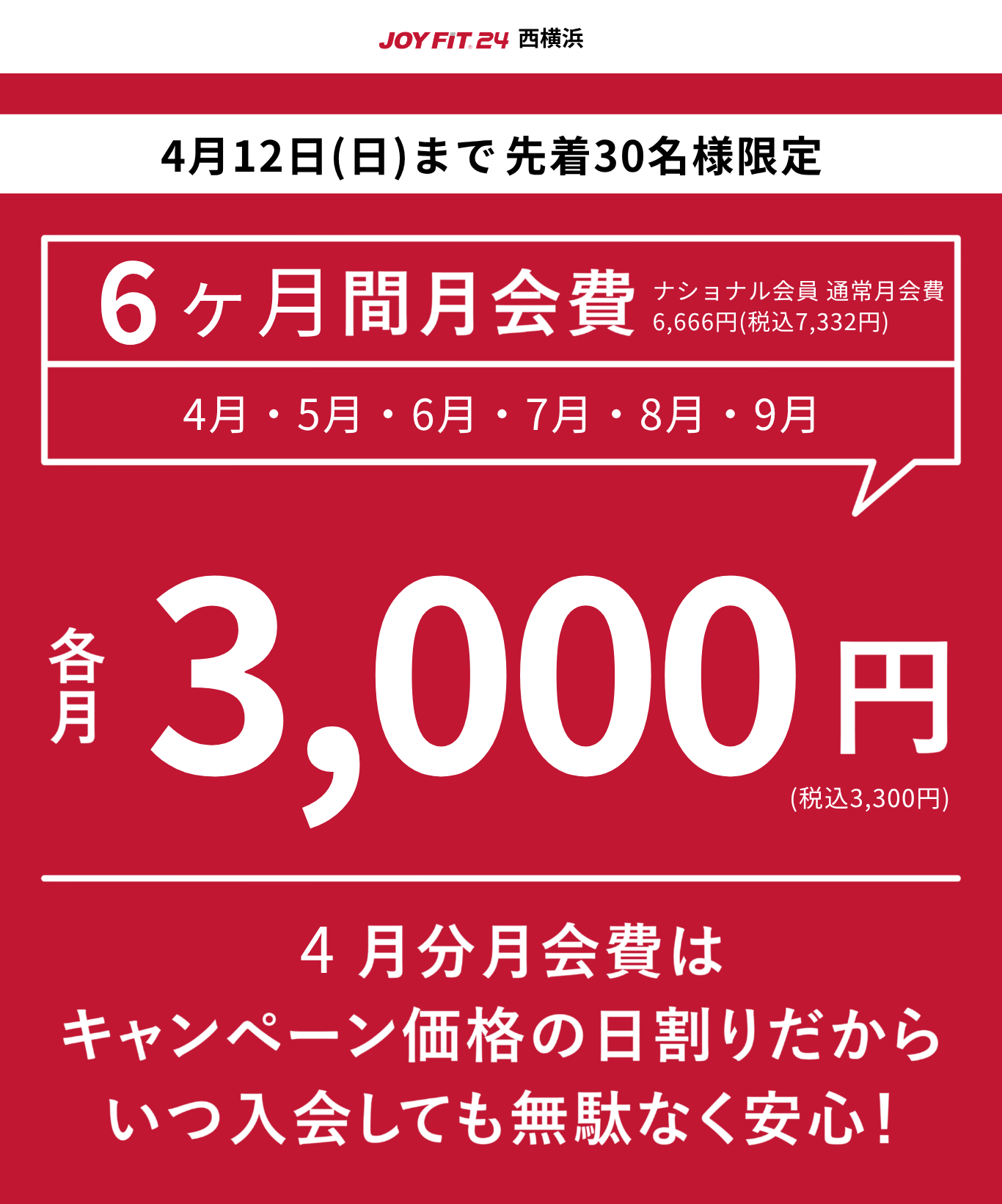 4月から9月分月会費が3,000円(税込3,300円)!