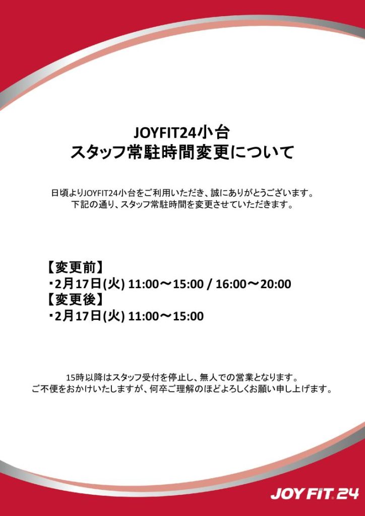 2月17日(火)のスタッフ常駐時間の変更をさせていただきます。