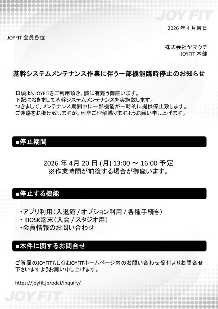 システムメンテナンスに伴い一部機能が停止いたします。