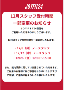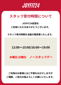 | その他 | ■24時間営業のスポーツクラブです。 ■スタッフ常駐時間 平日 12:00~15:00 / 16:00~21:00 土日祝日 12:00~15:00 / 16:00~19:00 ノースタッフデー:毎週月曜日・木曜日 ■貴重品につきましてはご自身で管理をお願いします。 ■シャンプー・リンス・ボディーソープ・タオルの貸し出しはございませんので、 各自でご用意をお願いいたします。 ※ドライヤーは貸し出しておりますので、ご自由にお使いください。 |