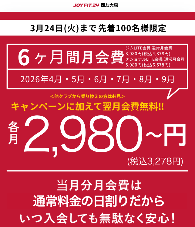| その他 | ジョイフィット24ジムLITE西友大森はスタッフ不在の無人店舗でございます。 ご入会・各種お手続きは【JOYFITアプリ】から可能です。 ※クレジットカード入会専用 ■貴重品につきましてはご自身で管理をお願いいたします。 ■タオル・ウェア等のレンタルはございませんので、各自ご用意をお願いいたします。 ■シャワーの付帯はございません。 |