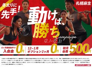 ※キャンペーン適用の場合、12月は「ジムLITE会員」でご登録となります。1月以降「ナショナル会員」に種別変更のご希望の場合、12月末までに店舗にご来館いただき変更のお手続きが必要です。お手続きがない場合、「ジムLITE会員」での登録が継続されますので予めご了承ください。