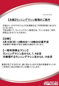 ランニングマシン修理による一部利用制限のお知らせ