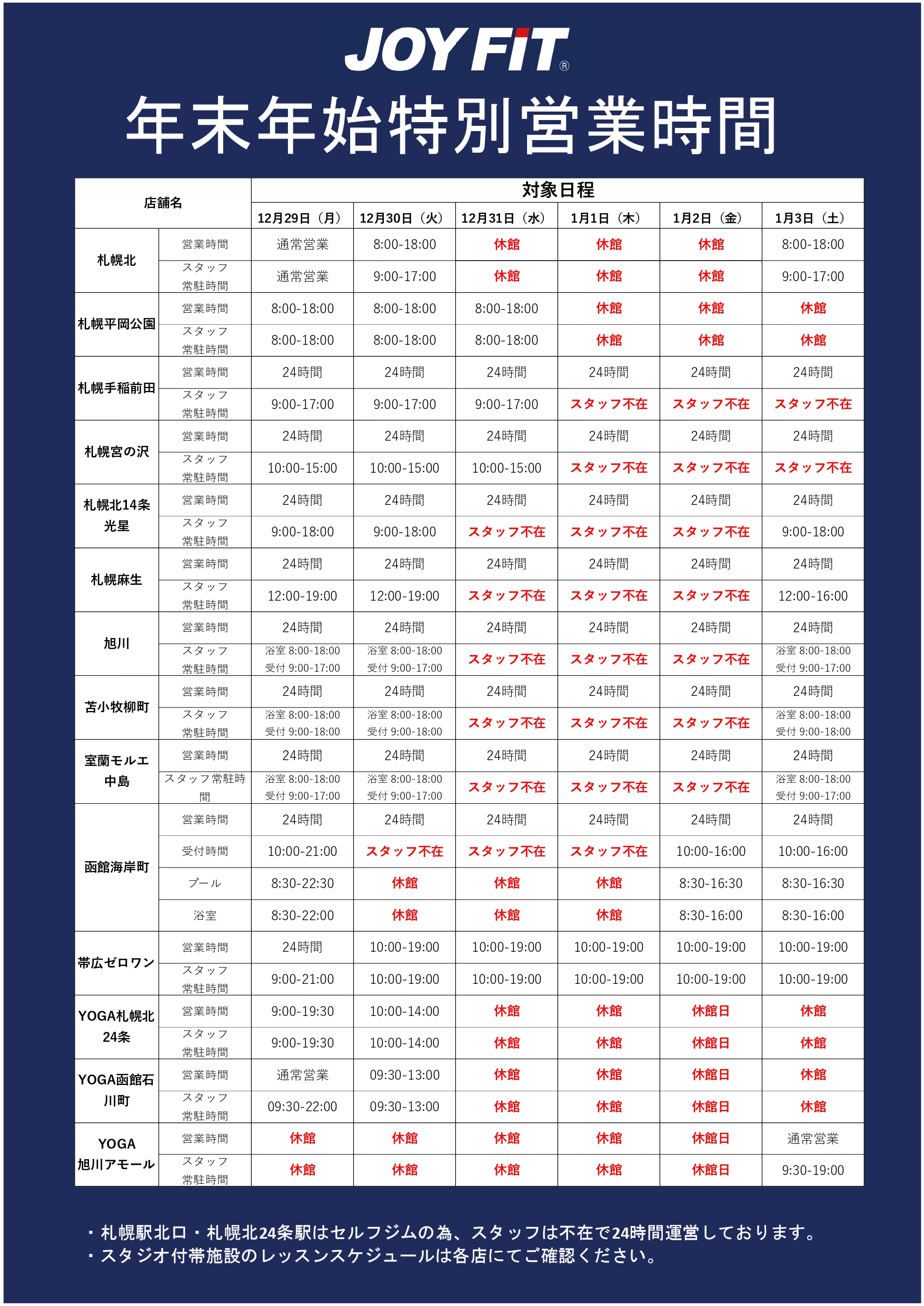 12/31~1/2は休館とさせていただきます。 12/30・1/3の営業時間は8時~19時まで、受付時間が9時~18時まででございます。