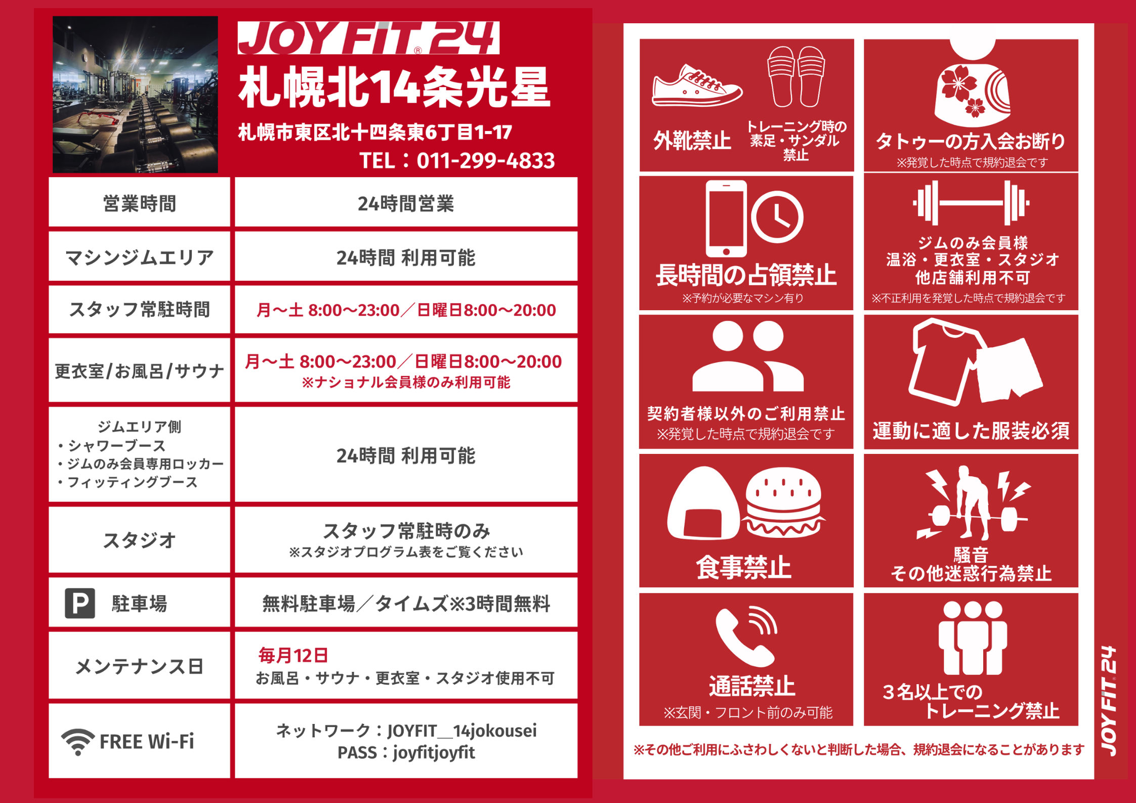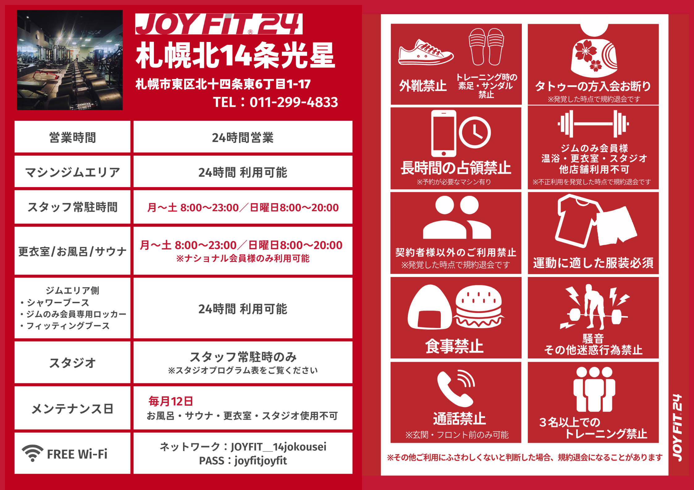 〒065-0014 北海道札幌市東区北14条東6丁目1−17 JOYFIT24札幌北14条光星