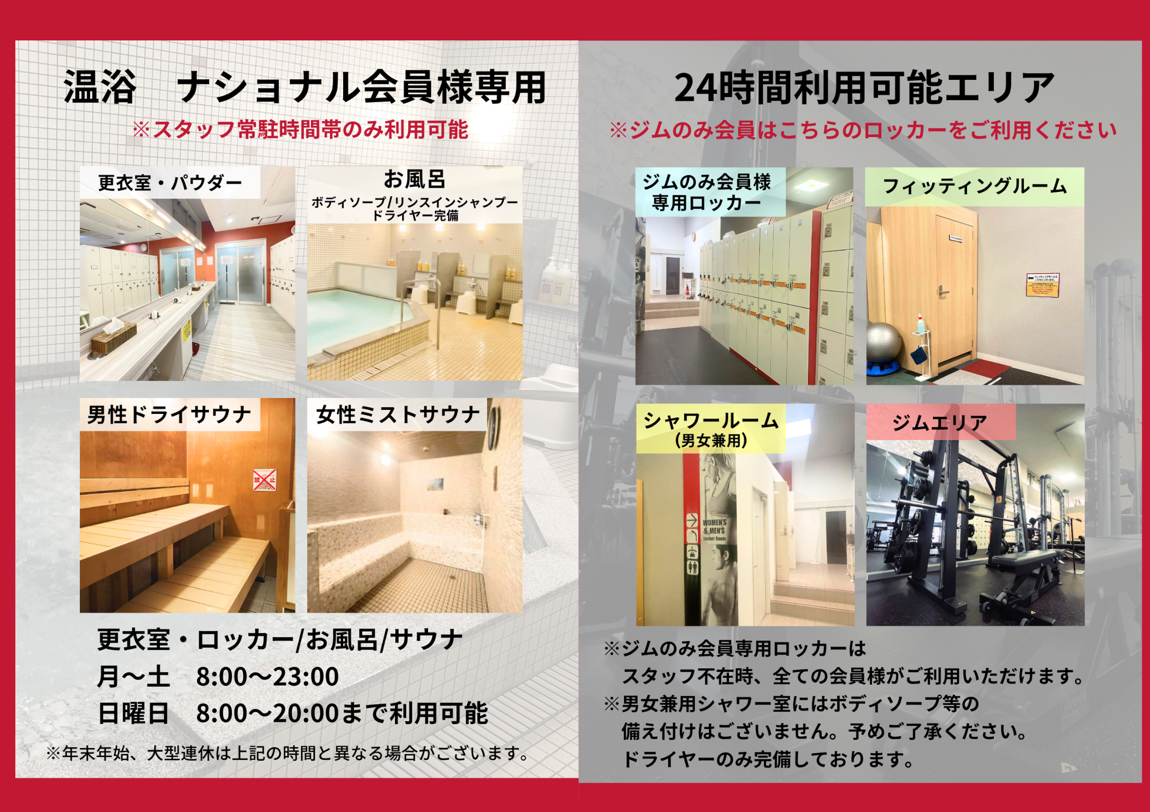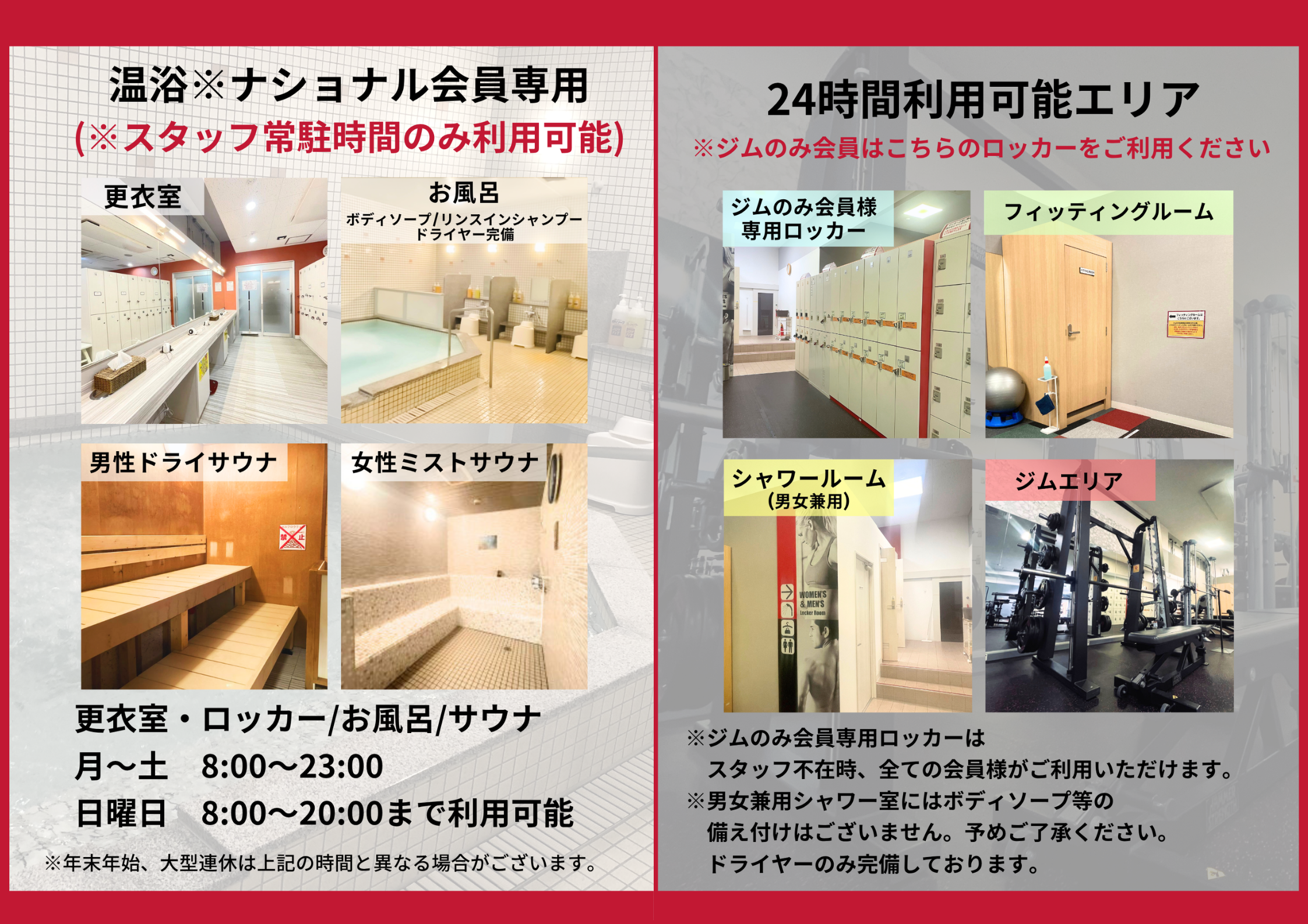 ※スタッフ常駐時間 月~土8:00~23:00 日曜日8:00~20:00 ※スタッフ不在時間 ⇒お風呂・更衣室使用できません 24時間シャワーと ジムのみ会員様専用ロッカー をご利用ください。 |