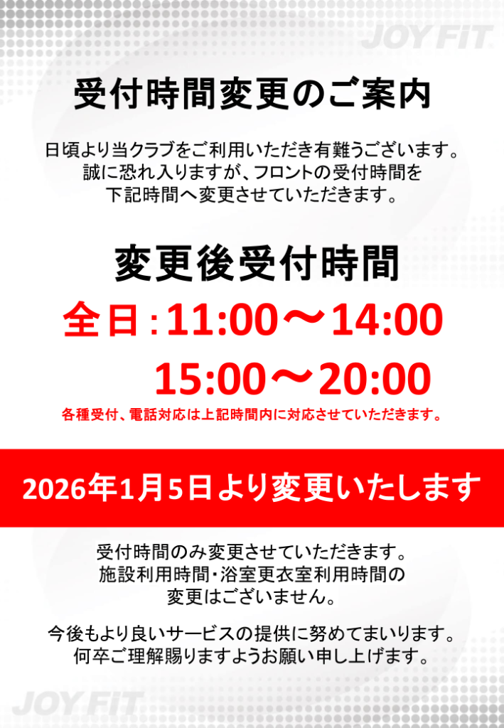 誠に恐れ入りますが、フロントの受付時間を下記時間へ変更させていただきます。
