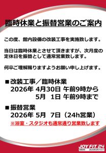 | 営業時間 | 営業時間 24時間営業(夜間は従業員が不在です) 受付時間 9:00-21:00(最終受付20:30) 【休館日】1/1(元旦)と毎月7日(奇数月はジムエリアのみ24時間ご利用いただけます) |