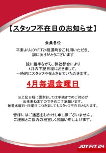 | 営業時間 | 24時間営業 受付時間 平日 12:00〜15:00/16:00〜21:00 土曜・祝日 12:00〜15:00/16:00〜19:00 毎週水曜日・日曜日は終日スタッフ不在でございます。 ※スタッフ不在日のご入会受付はJOYFITアプリよりお手続き可能でございます(クレジットカード決済のみ対応)。 その他のお問い合わせに関しましてはホームページのお問い合わせフォームからお願いいたします。 |