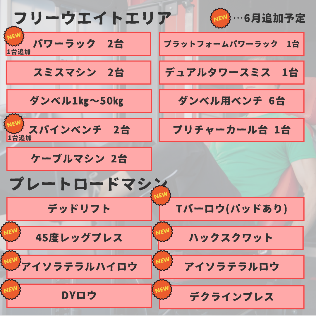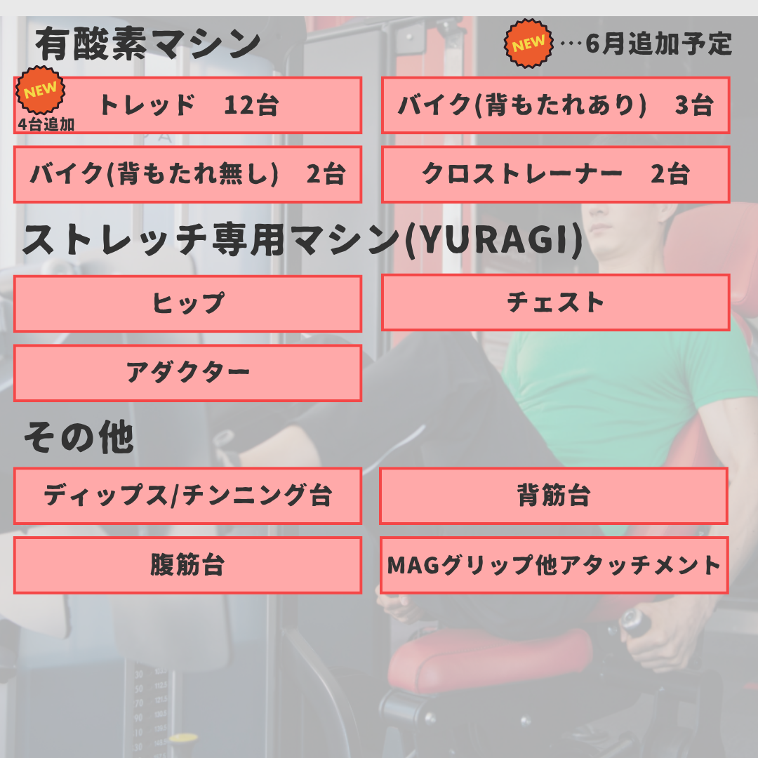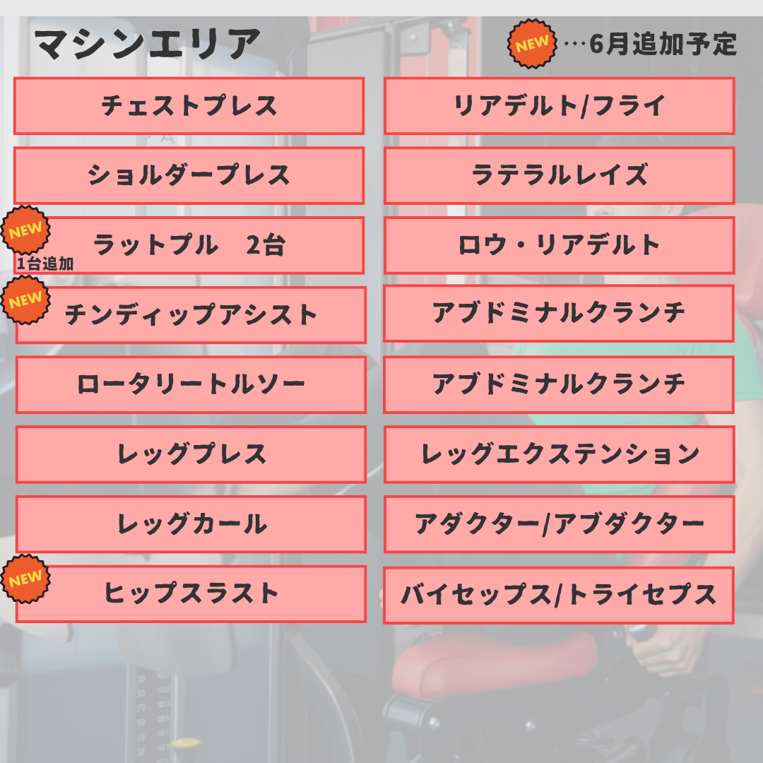 | その他 | ☆入会を悩まれている方はこちらをタップ☆![]() ☆館内の見学は入口画像をタップ☆ ![]() ■24時間営業のスポーツクラブです。ヴァーチャルスタジオ付き! レッスンプログラムについては、決定次第アップ致します。 ■スタッフ常駐時間 12:00-15:00/16:00-19:00 毎週火・土曜日はスタッフ不在 マシンの説明等はご案内させて頂きます。※ご予約が必要でございます。 ■貴重品につきましてはご自身で管理をお願いします。 ■シャンプー・リンス・ボディーソープ・タオルの貸し出しはございませんので、 各自でご用意をお願いいたします。 ※ドライヤーは貸し出しておりますので、ご自由にお使いください。 |