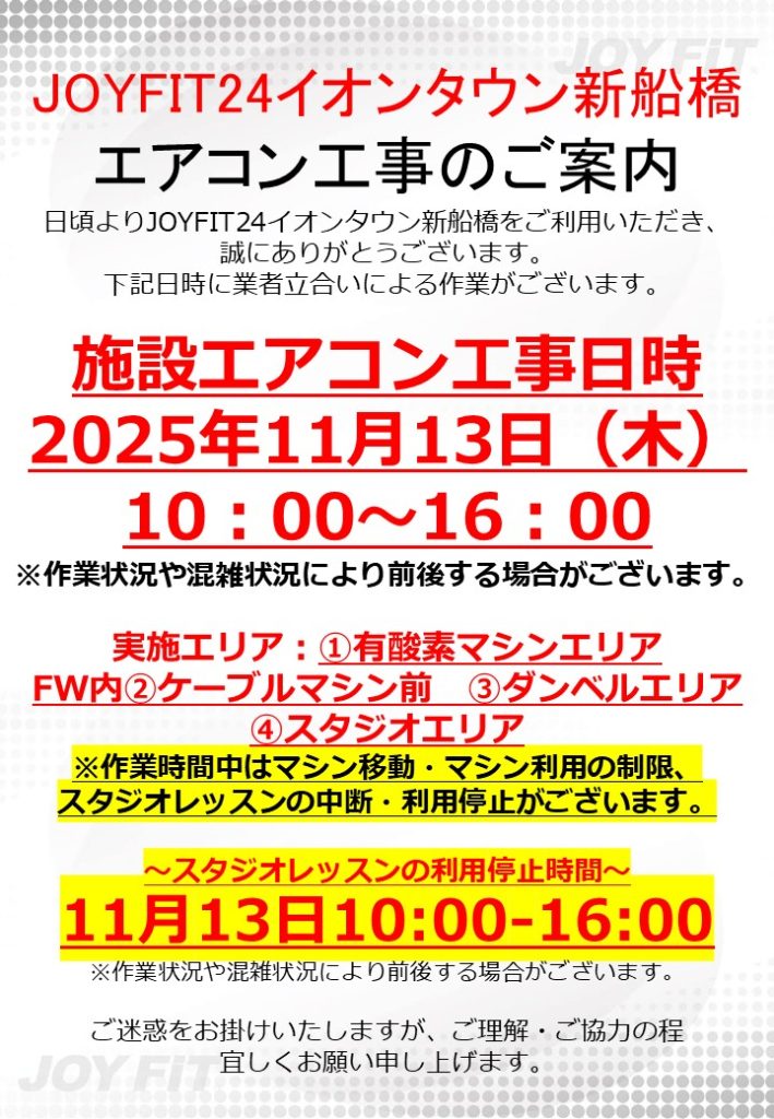 施設内エアコン工事のお知らせ 【実施日時 11月13日(木) 10:00~16:00】