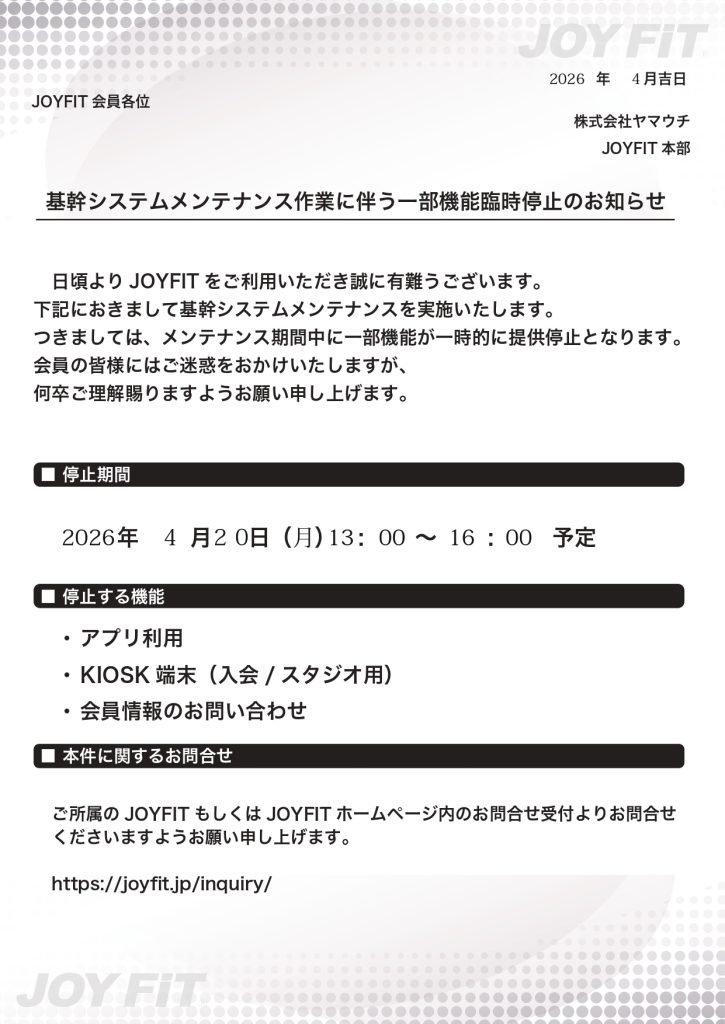 「4月20日(月)13:00~16:00(予定)」にて、JOYFITアプリを含めたシステムメンテナンスを行います。