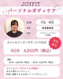 | パーソナルボディケア | カウンセリング + ボディケア | 60分 4,950円 (税込) | 60分 8,250円 (税込) |