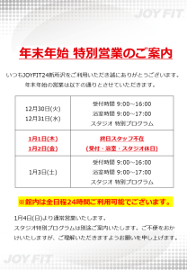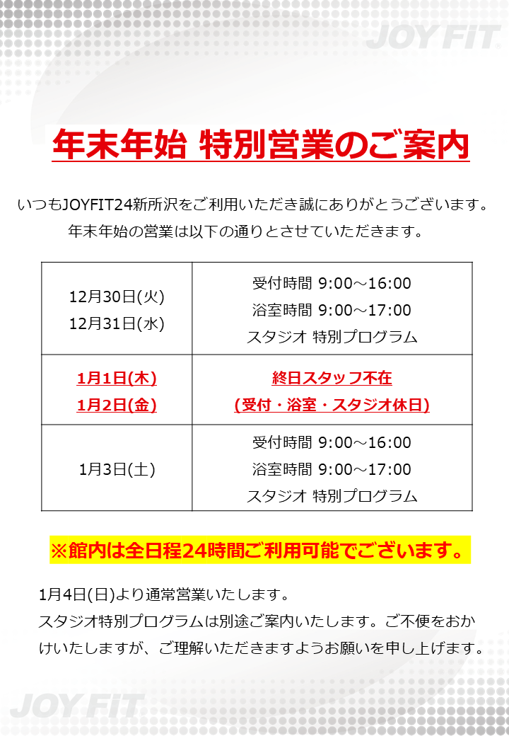 年末年始のスタジオ・浴室・受付時間に関しまして、 特別営業とさせていただきます。 ジムエリア・24時間エリアに関しましては通常通り24時間ご利用が可能でございます。