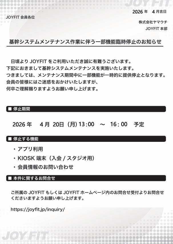 日頃よりJOYFITをご利用いただき誠にありがとうございます。
