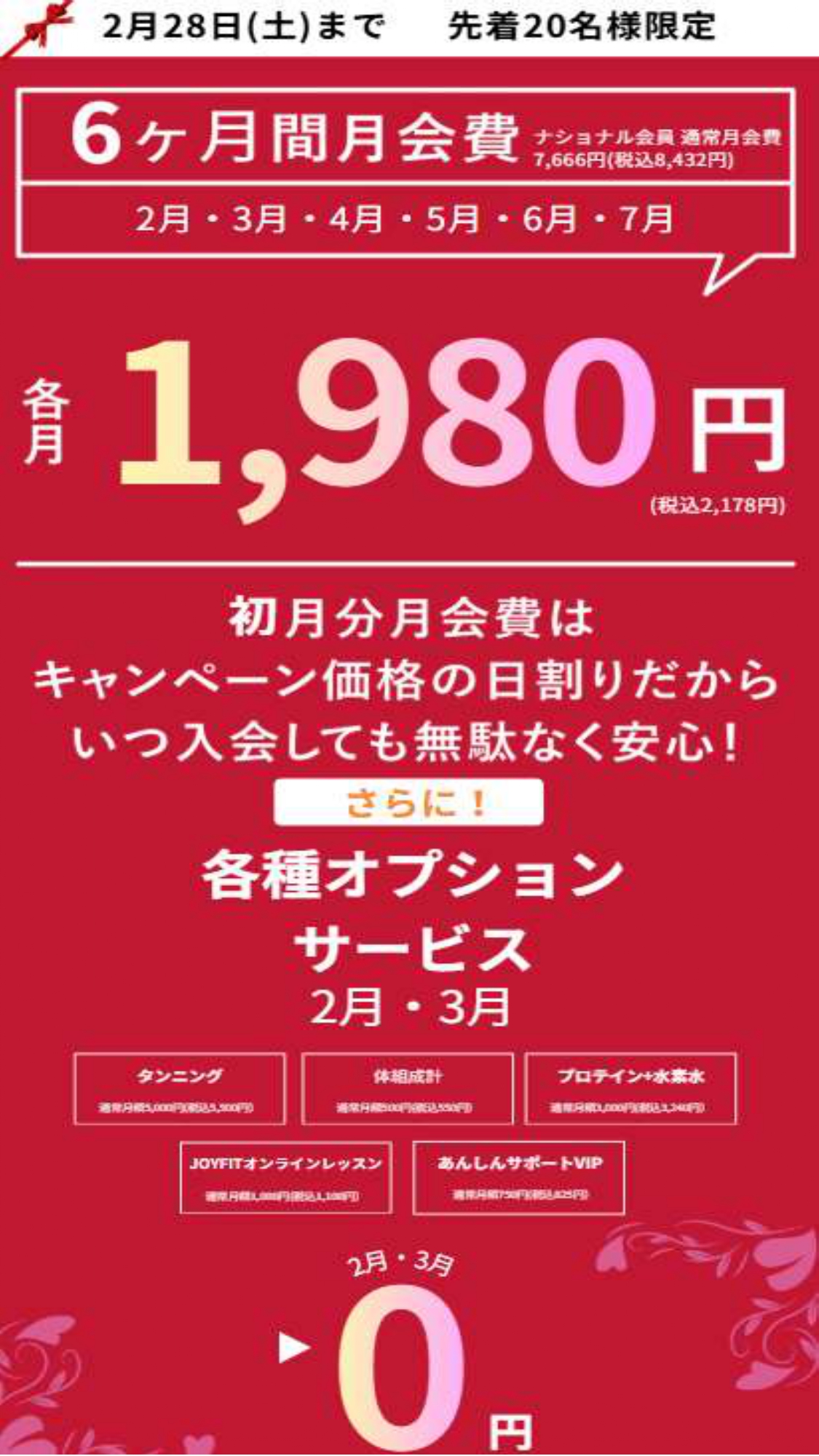 ・水素水飲み放題&プロテインサーバー1日6杯(税込3,240円)、体組成計(税込550円)、あんしんサポートVIPプラン(税込825円)、日焼けマシン【男性限定】(税込5,500円)、オンラインレッスン(税込1,100円)が