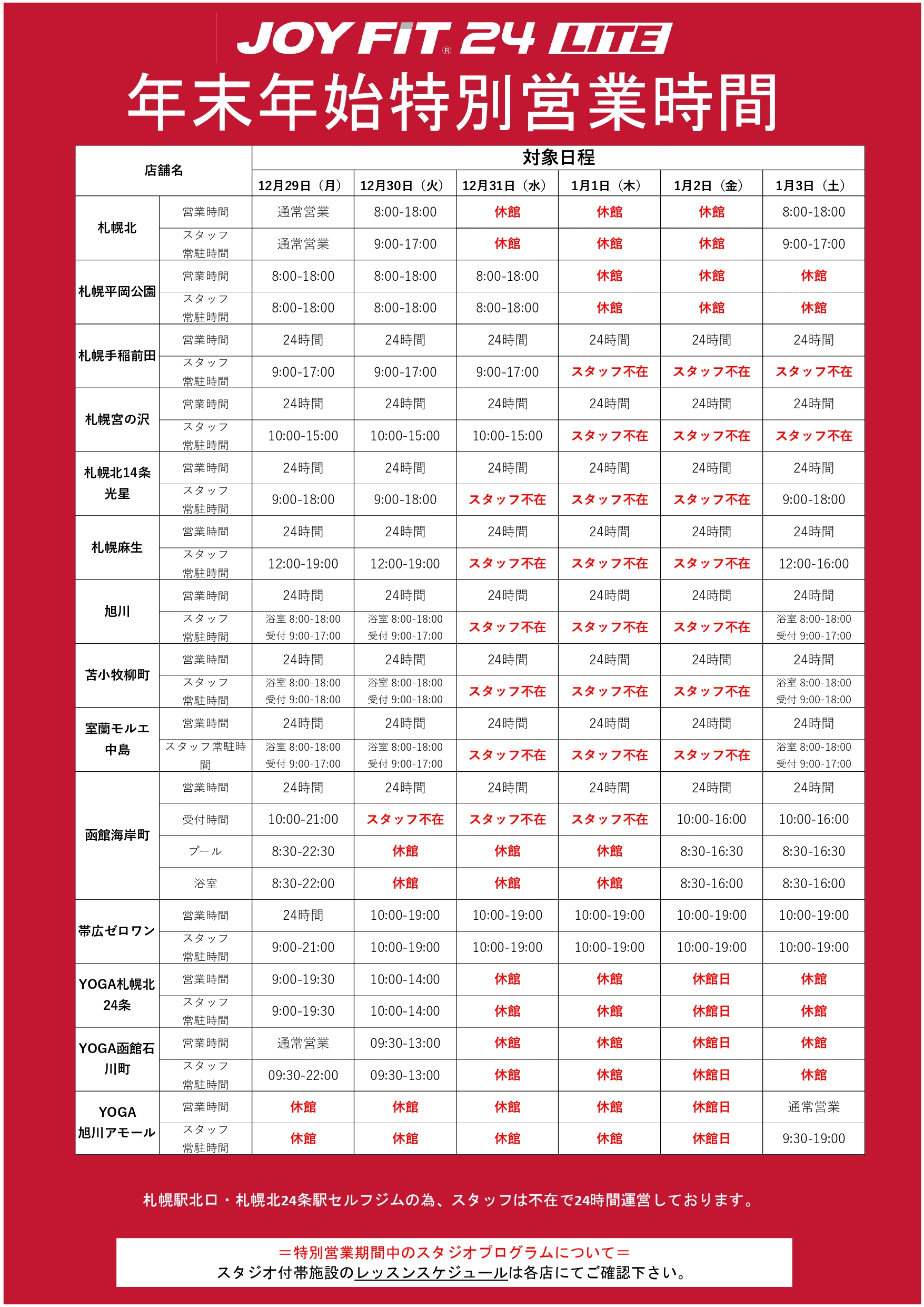 年末年始営業時間について