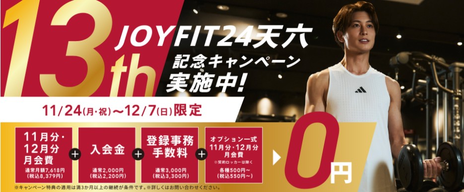 ※キャンペーン特典の適用は満3ヶ月以上の在籍及び上記各種オプションのご加入を条件とさせていただきます。 ※ご入会より満3ヶ月以内に退会される方は解約金8,379円が発生いたします。 ※各種オプション費は、施設利用の月会費とは別途かかります。 ※各種オプションは無料期間内での解約が可能です。なお、無料期間中に解約を行わなかった場合は自動継続となります。 ※詳しくはお問い合わせください。