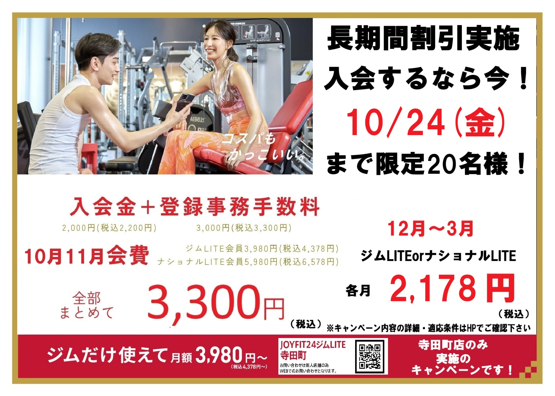 ※JOYFIT24ジムLITE寺田町店をご退会後、12ヶ月以内の方は当キャンペーンをご利用頂けません。