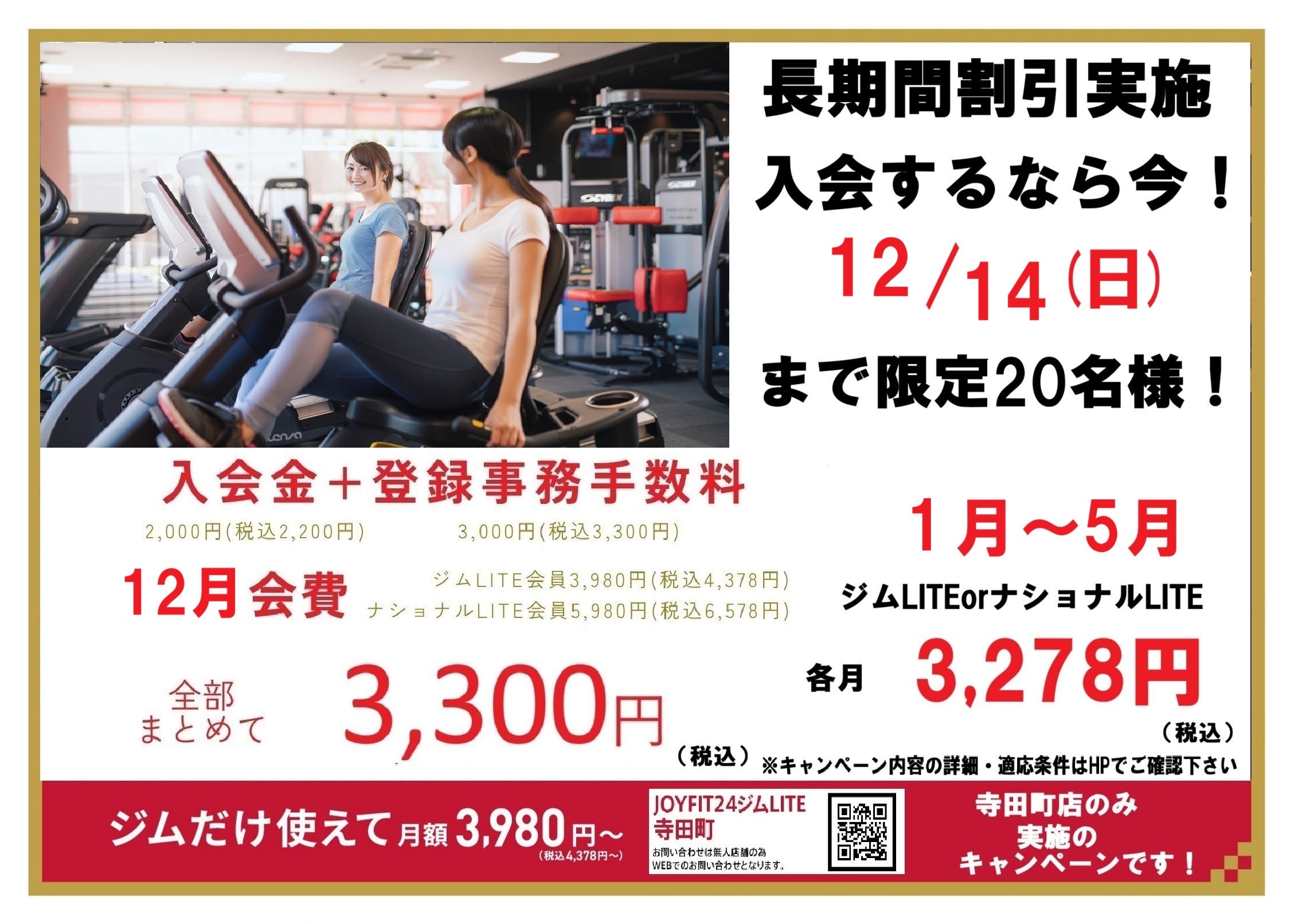 ※JOYFIT24ジムLITE寺田町店をご退会後、12ヶ月以内の方は当キャンペーンをご利用頂けません。