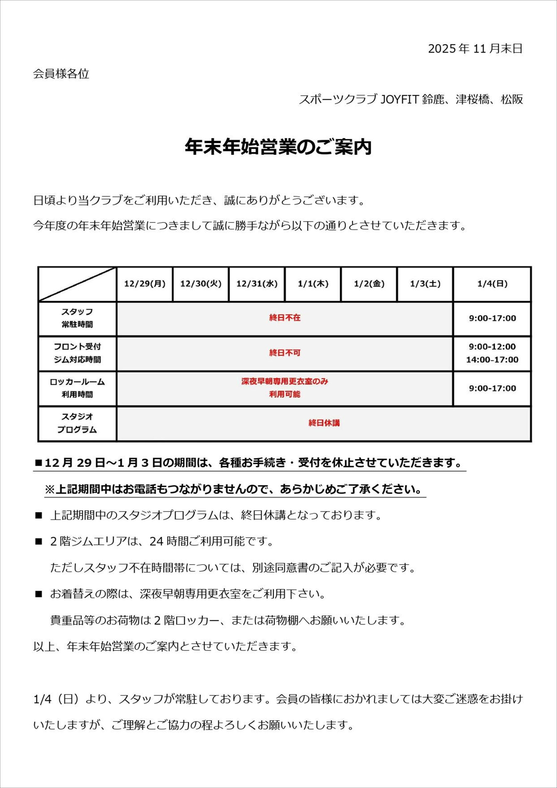 年末年始営業についてのご案内