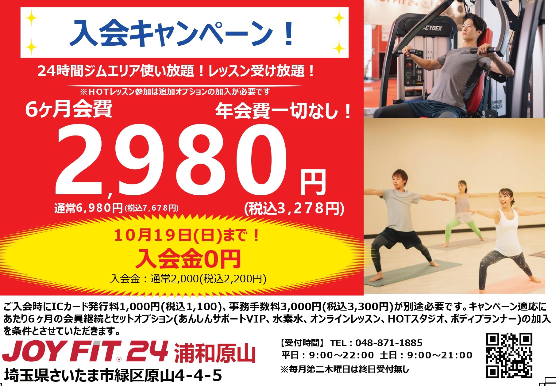 営業時間 | =============================================== ◇◆◇営業時間◇◆◇ 【ジムエリア利用可能時間】 24時間 【スタッフ在中時間】 月曜日~金曜日8:00~23:00 土曜日・日曜日8:00~22:00 【更衣室・シャワーブース利用時間】 月曜日~金曜日8:00~23:00 土曜日・日曜日8:00~22:00 【受付時間】 月曜日~金曜日8:00~22:00 土曜日・日曜日8:00~21:00 ※毎月第2木曜日は、ジムエリアのみ開放致します。終日スタジオレッスンは、休講とさせていただきます。スタッフも不在となります。 =============================================== ◇◆◇ 誓約書ご記入のお願い ◇◆◇ 日頃よりジョイフィット24浦和原山をご愛顧いただきまして誠にありがとうございます。 この度、2020年2月14日(金)より24時間営業となりました。 それに伴い全会員様(タイム会員を除く)に誓約書のご記入をお願いしております。 誓約書をご提出していただきませんと、スタッフ不在の時間のご利用は出来ませんので、ご了承賜りますようお願い申し上げます。 ご利用の前に、スタッフ在中時間にお越しいただきフロントにてお手続きをお願いいたします。 皆様のご理解とご協力をお願い申し上げます。 =============================================== ◇◆◇タイム会員の皆様へ◇◆◇ 2020年4月1日より会員カードへの入金(チャージ)の受付を誠に勝手ながら終了させていただきます。 また、2020年2月14日(金)8:00より【タイム会員利用時間内】でのご利用をお願いしております。 【タイム会員利用時間】 月曜日~金曜日8:00~23:00 土曜日・日曜日8:00~22:00 何卒ご理解とご了承を賜りますようお願い申し上げます。 ※毎月第2木曜日は、終日スタッフ不在のためご利用いただけません。 ※カードに残っているプリペイド残高に関しましては、2020年4月1日以降もご利用いただくことが出来ますのでご安心ください。(プリペイド残高のご返金は受けかねますのでご了承ください。) 〓〓〓〓〓〓〓〓〓〓〓〓〓〓〓〓〓〓〓〓〓〓〓〓〓〓〓 無料駐車場70台完備!! |