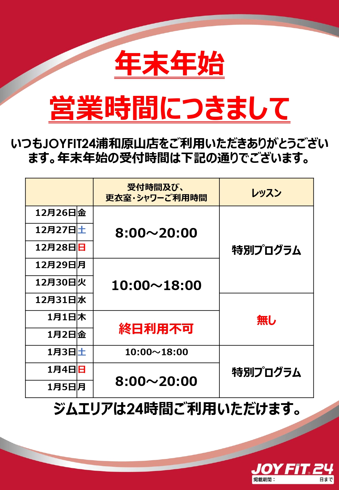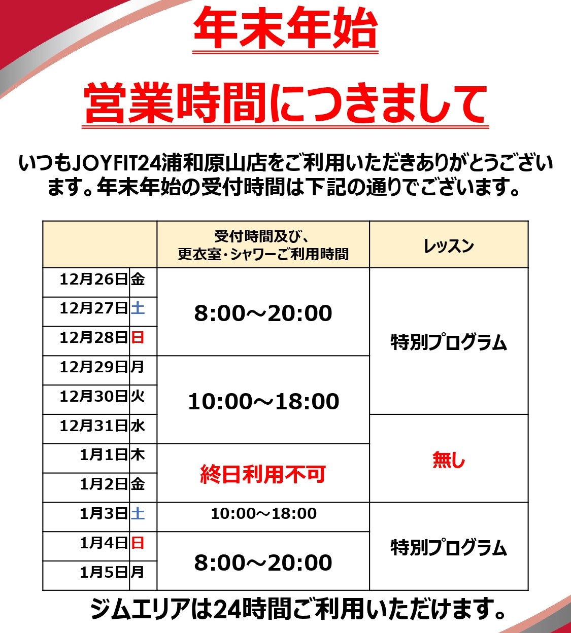| 営業時間 | =============================================== ◇◆◇営業時間◇◆◇ 【ジムエリア利用可能時間】 24時間 【スタッフ在中時間】 月曜日~金曜日8:00~23:00 土曜日・日曜日8:00~22:00 【更衣室・シャワーブース利用時間】 月曜日~金曜日8:00~23:00 土曜日・日曜日8:00~22:00 【受付時間】 月曜日~金曜日8:00~22:00 土曜日・日曜日8:00~21:00 ※毎月第2木曜日は、ジムエリアのみ開放致します。終日スタジオレッスンは、休講とさせていただきます。スタッフも不在となります。 =============================================== ◇◆◇ 誓約書ご記入のお願い ◇◆◇ 日頃よりジョイフィット24浦和原山をご愛顧いただきまして誠にありがとうございます。 この度、2020年2月14日(金)より24時間営業となりました。 それに伴い全会員様(タイム会員を除く)に誓約書のご記入をお願いしております。 誓約書をご提出していただきませんと、スタッフ不在の時間のご利用は出来ませんので、ご了承賜りますようお願い申し上げます。 ご利用の前に、スタッフ在中時間にお越しいただきフロントにてお手続きをお願いいたします。 皆様のご理解とご協力をお願い申し上げます。 =============================================== ◇◆◇タイム会員の皆様へ◇◆◇ 2020年4月1日より会員カードへの入金(チャージ)の受付を誠に勝手ながら終了させていただきます。 また、2020年2月14日(金)8:00より【タイム会員利用時間内】でのご利用をお願いしております。 【タイム会員利用時間】 月曜日~金曜日8:00~23:00 土曜日・日曜日8:00~22:00 何卒ご理解とご了承を賜りますようお願い申し上げます。 ※毎月第2木曜日は、終日スタッフ不在のためご利用いただけません。 ※カードに残っているプリペイド残高に関しましては、2020年4月1日以降もご利用いただくことが出来ますのでご安心ください。(プリペイド残高のご返金は受けかねますのでご了承ください。) 〓〓〓〓〓〓〓〓〓〓〓〓〓〓〓〓〓〓〓〓〓〓〓〓〓〓〓 無料駐車場70台完備!! |