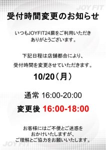 【受付時間】(JOYFIT蕨) 平日 11:00~15:00 16:00~20:00 土祝 11:00~15:00 16:00~18:00 ※ご入会の場合はスタッフ受付時間の50分前までにご来館をお願い致します。 ※受付時間を過ぎるお手続きの場合、当日のご対応が出来ない場合もございます。 ※毎週金曜日、日曜日は終日スタッフ不在とさせていただきます。 |